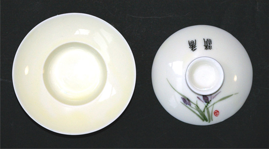 薄胎の蓋碗精巧で美しい陶磁器の茶道具の蓋碗は茶碗、茶蓋、茶船のスリーピースからなり紫砂と同じくらい美しいとされます。蓋碗は三才碗とも呼ばれます。三才とは天、地、人の意味です。一組の蓋碗は小さな茶道具ながら小宇宙を構成し、古代の哲人の思想を秘めているそうです。茶船に収まった茶碗はとても安定して倒れにくく、お茶を飲むのに最適な茶器です。 |