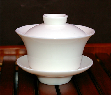 ボーンチャイナの蓋碗精巧で美しい陶磁器の茶道具の蓋碗は茶碗、茶蓋、茶船のスリーピースからなり紫砂と同じくらい美しいとされます。蓋碗は三才碗とも呼ばれます。三才とは天、地、人の意味です。一組の蓋碗は小さな茶道具ながら小宇宙を構成し、古代の哲人の思想を秘めているそうです。茶船に収まった茶碗はとても安定して倒れにくく、お茶を飲むのに最適な茶器です。 |